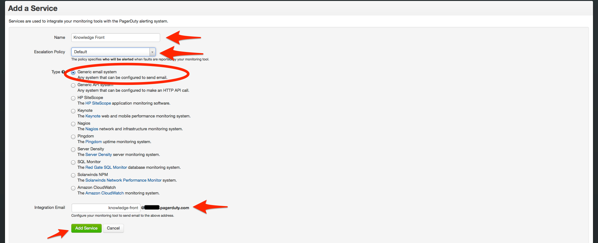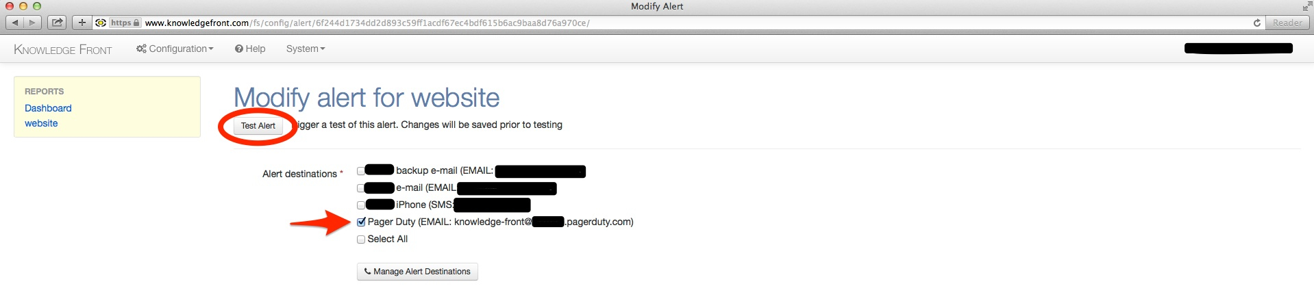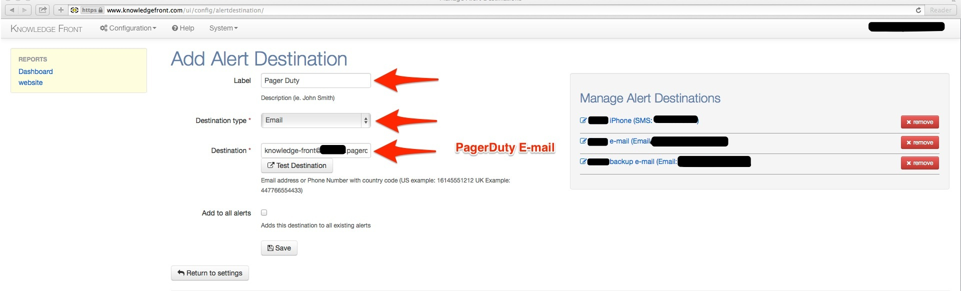 Log onto the Knowledge Front website. Select “Configuration”->“Alert Destinations” from the main menu. Use the “Add Alert Destination” form to configure a new e-mail destination for your custom PagerDuty integration e-mail address: