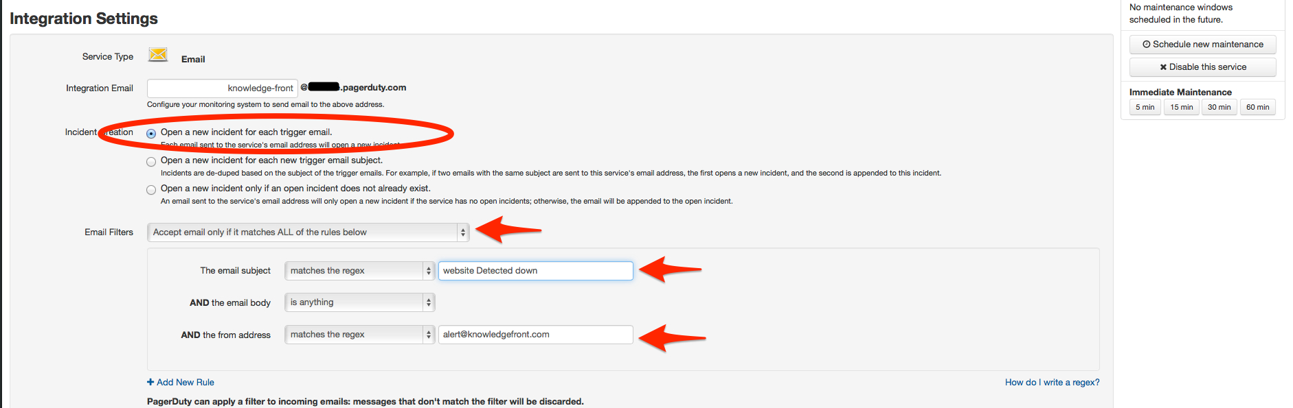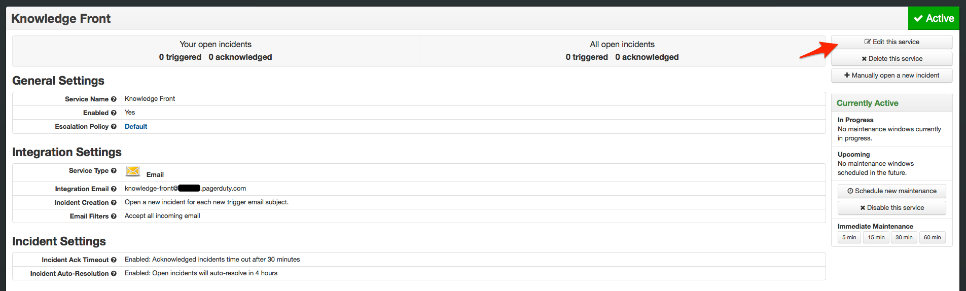 Once the initial service configuration is done, you’ll want to use “Edit this service” to add e-mail filters to help control the behavior of PagerDuty as it receives e-mail alerts from Knowledge Front: