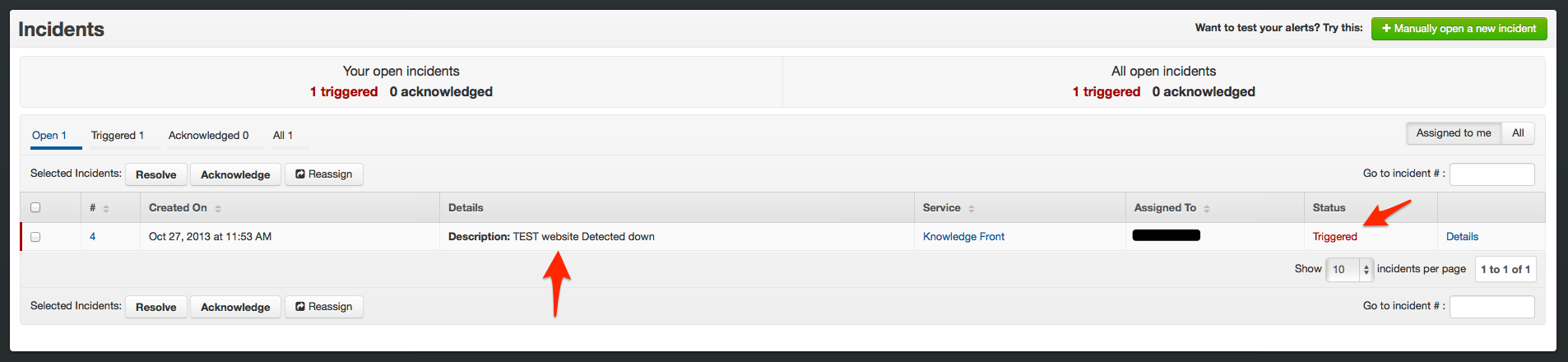 Flipping back to your PagerDuty “Incidents” dashboard, you should see a new incident from the Knowledge Front service (and any of your configured e-mail or SMS notifications within PagerDuty should fire off as well):